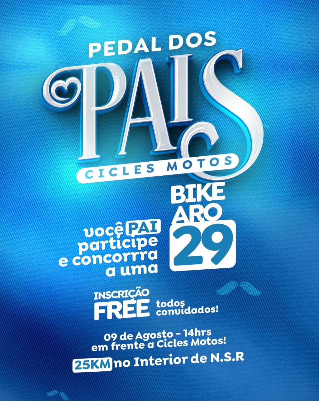Neste sábado à tarde, a partir das 14h, a Cicles Motos promove o “Pedal dos Pais”, um evento especial em comemoração ao Dia dos Pais que promete movimentar a cidade com muita energia, saúde e confraternização. O destaque do evento é o sorteio de uma bicicleta novinha entre os pais participantes do percurso.