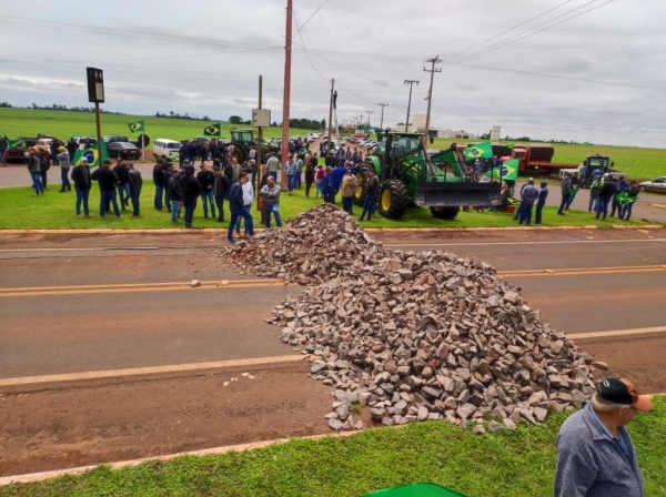 A rodovia estadual PR-182 no trevo de Maripá está bloqueada desde a manhã desta terça-feira, manifestantes colocaram pedras para obstruir a passagens de veículos. Maquinários Agrícolas estão no local juntamente com veículos de passeio.