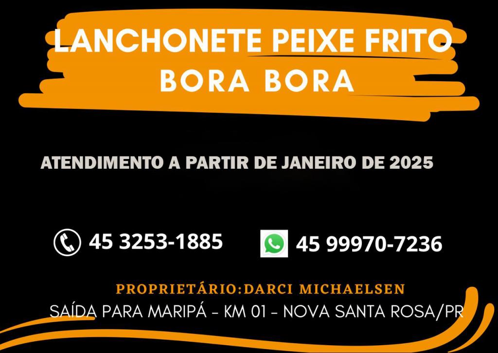 O Peixe Frito Bora Bora de Nova Santa Rosa comunica aos amigos e clientes que o proprietário, Sr. Darci Michaelsen, passou por um procedimento cirúrgico e está bem, mas em repouso, por isso o atendimento aos clientes volta a ser normalizado somente em janeiro de 2025, permanecendo fechado neste mês de dezembro.