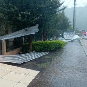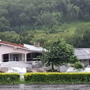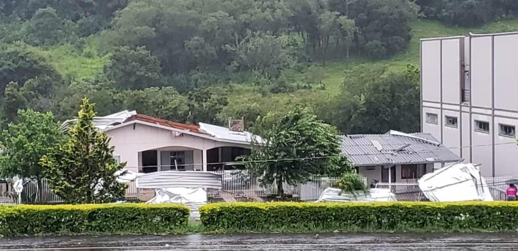 Com a força do vento, o telhado de uma borracharia ficou completamente descoberto próximo à BR-277 e a cobertura de uma empresa de concreto também caiu.