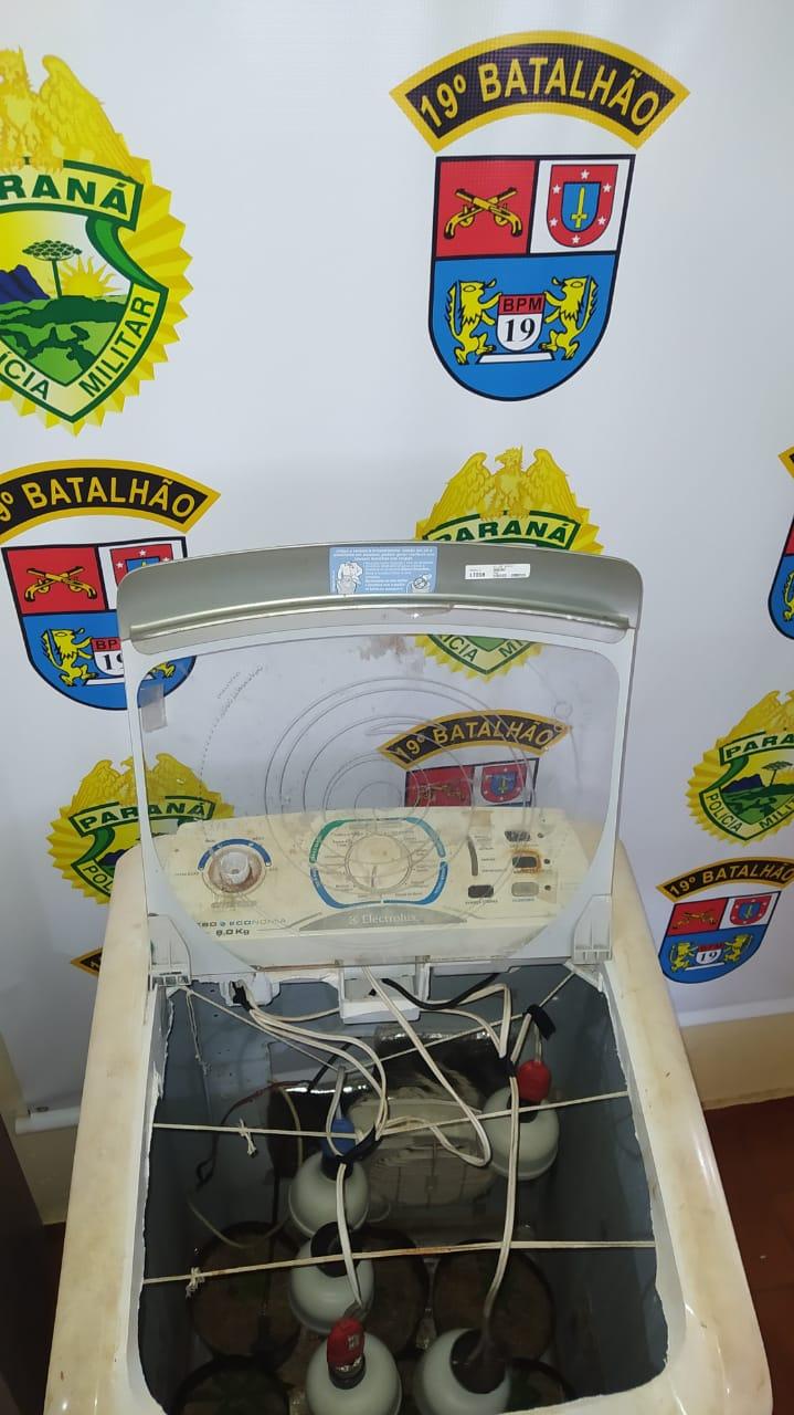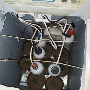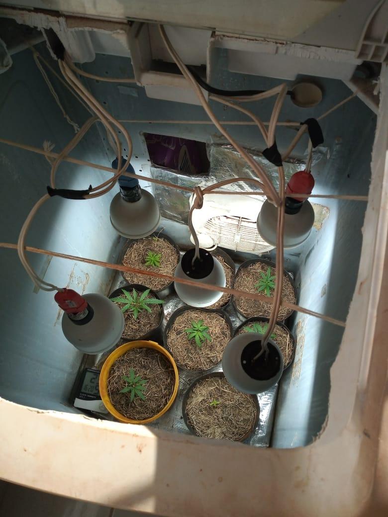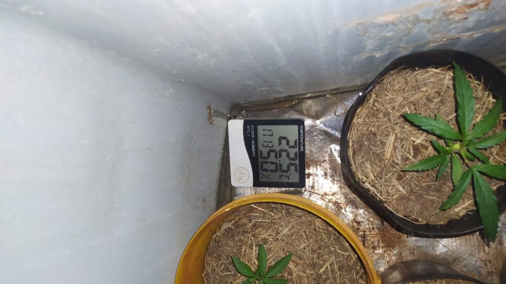 Indagado se na casa de havia mais ilícitos um dos rapazes disse que sim, na sequência, a equipe deslocou até a casa loca lizada no bairro Pérola e foi encontrado mais vinte e nove gramas de maconha, cinco gramas de sementes de cannabis sativa, também foi encontrado no quarto uma estufa improvisada em uma máquina de lavar com oito pés de maconha no seu interior.