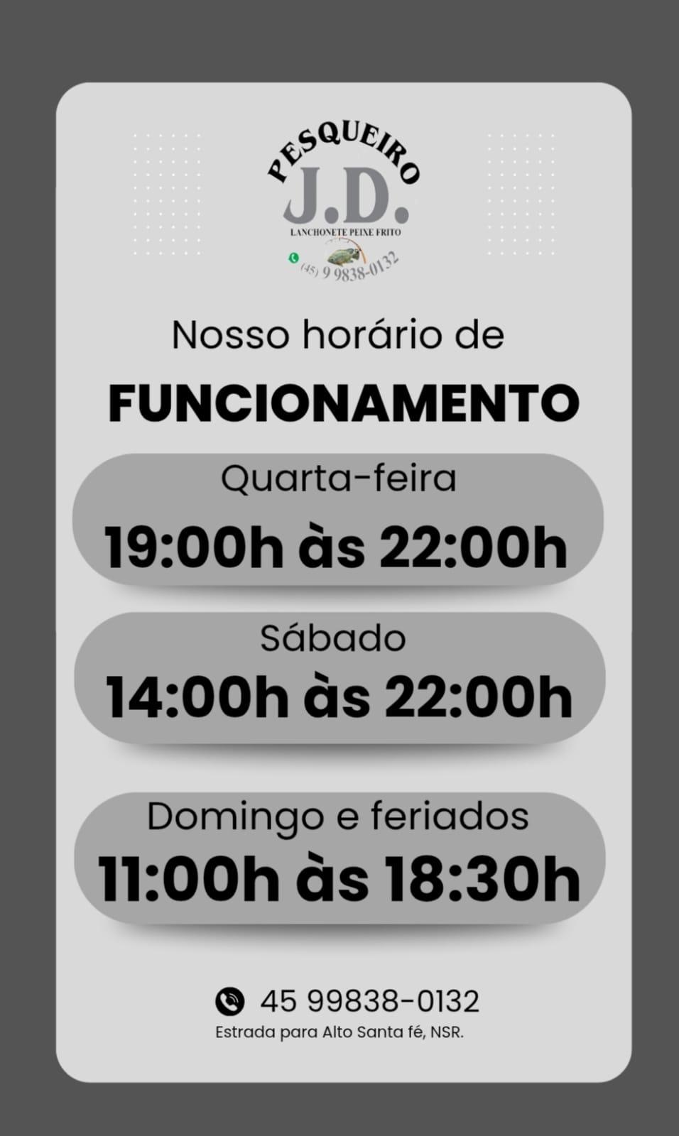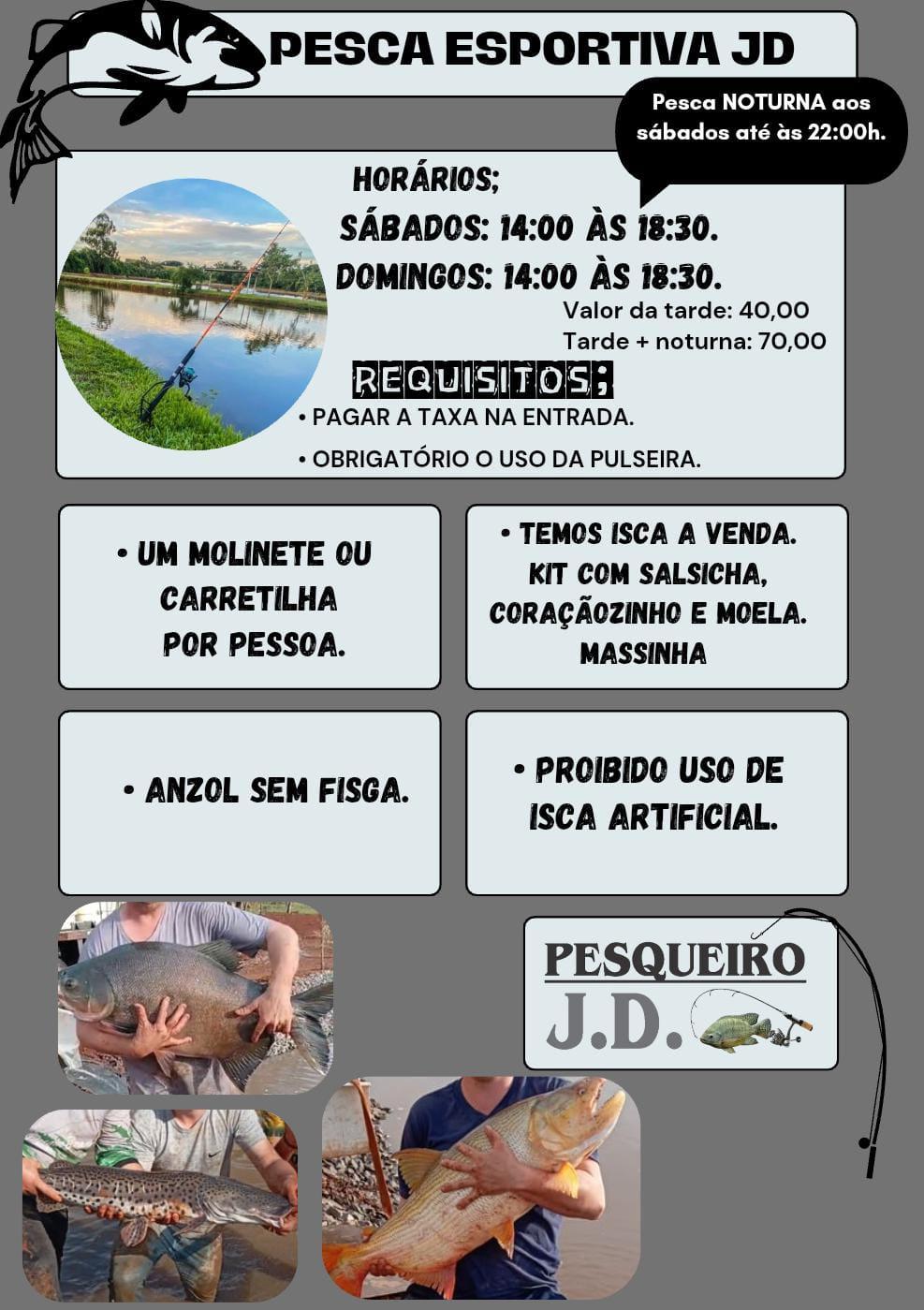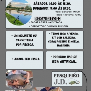 O Pesqueiro JD oferece a modalidade de pesca esportiva com toda a estrutura necessária para os pescadores. Os horários de funcionamento para essa atividade são: