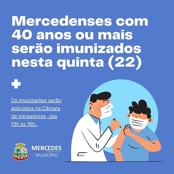 Os mercedenses que tiverem 40 anos ou mais serão imunizados na Câmara de Vereadores, das 13h às 16h. Serão utilizadas doses da AstraZeneca, CoronaVac e Pfizer.