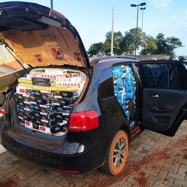 Foram apreendidos um Spacefox e um Onix carregados com aproximadamente 40.000 maços de cigarros paraguaios.