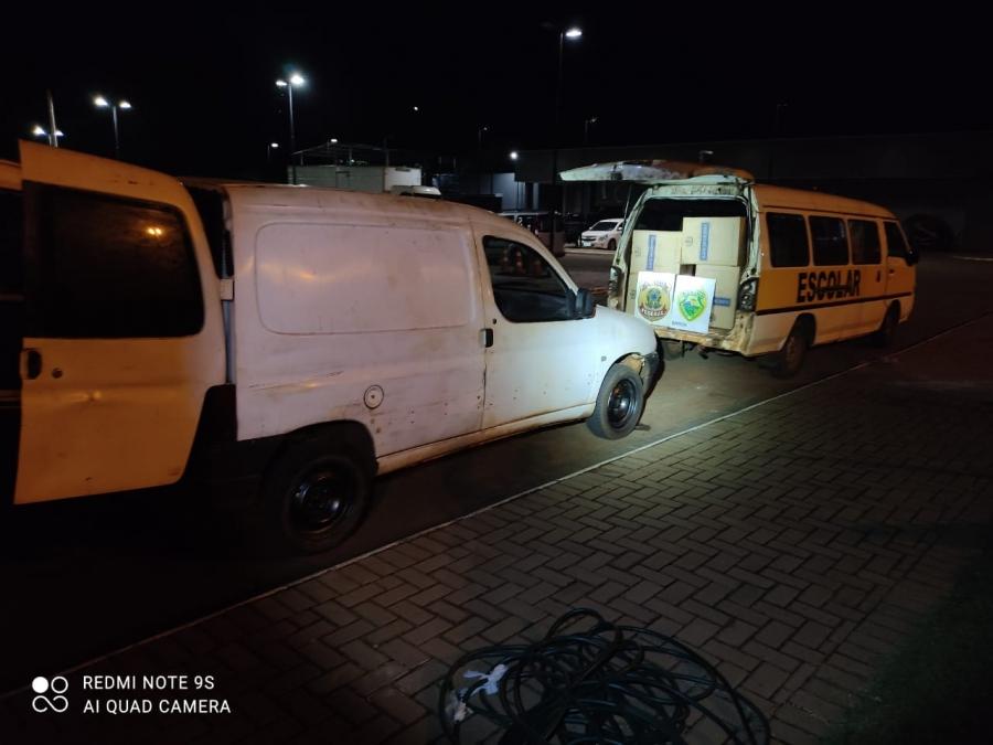 A ação integrada entre Polícia Federal e BPFron/PMPR resultou na apreensão de duas vans carregadas com aproximadamente 50 mil carteiras de cigarros contrabandeados do Paraguai, acarretando um prejuízo total estimado de trezentos mil reais ao crime organizado.