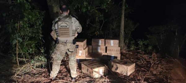 Quando da aproximação a um Porto Clandestino, foram localizadas, ao abandono, cerca de 40 (quarenta) caixas de cigarro paraguaio, escondidas em meio a mata ciliar.