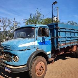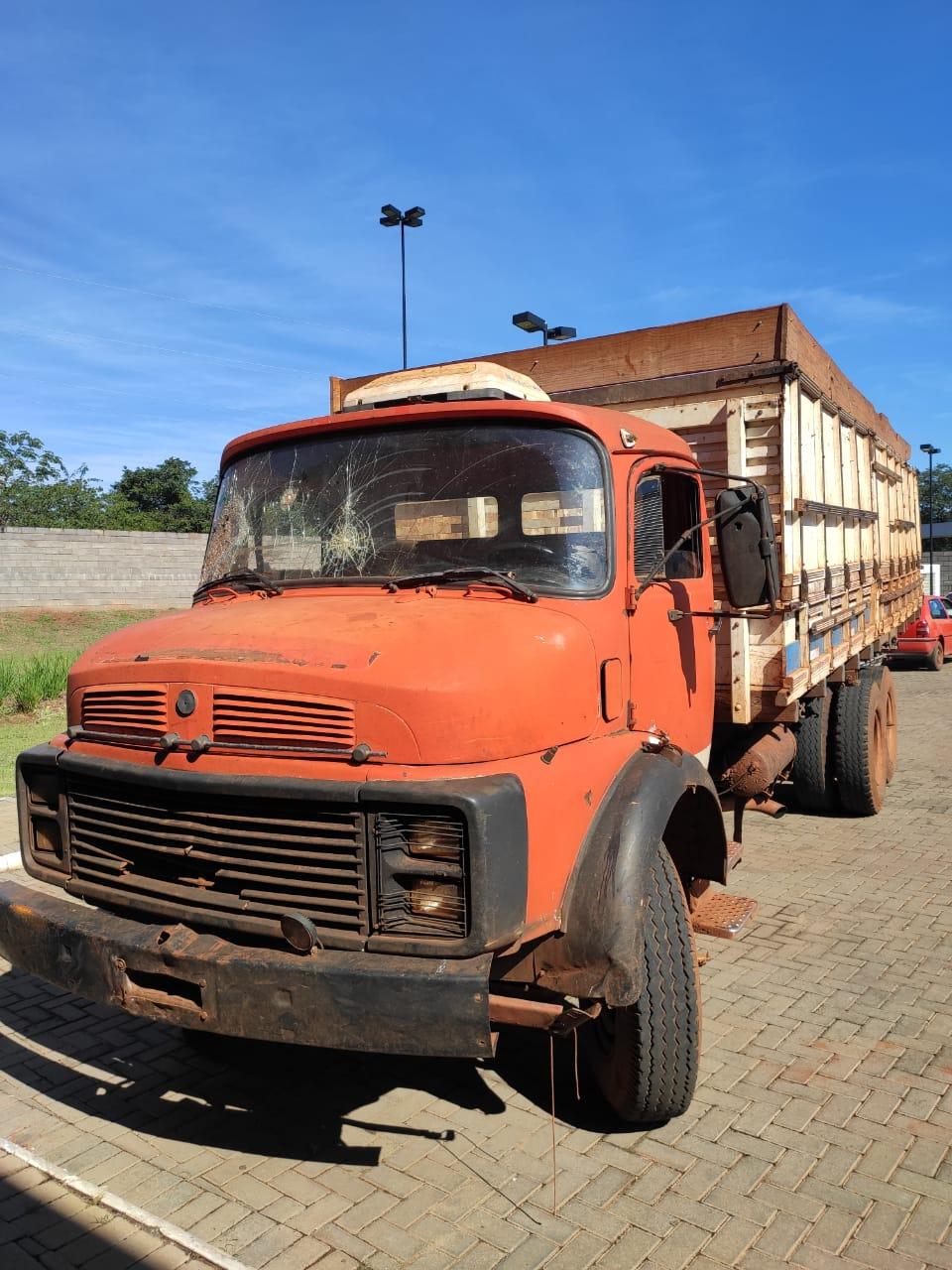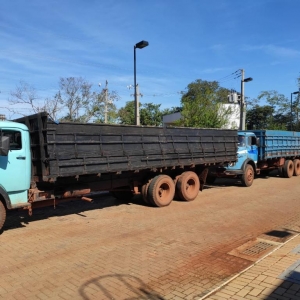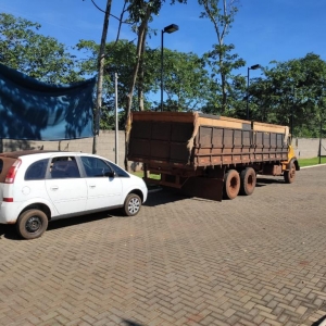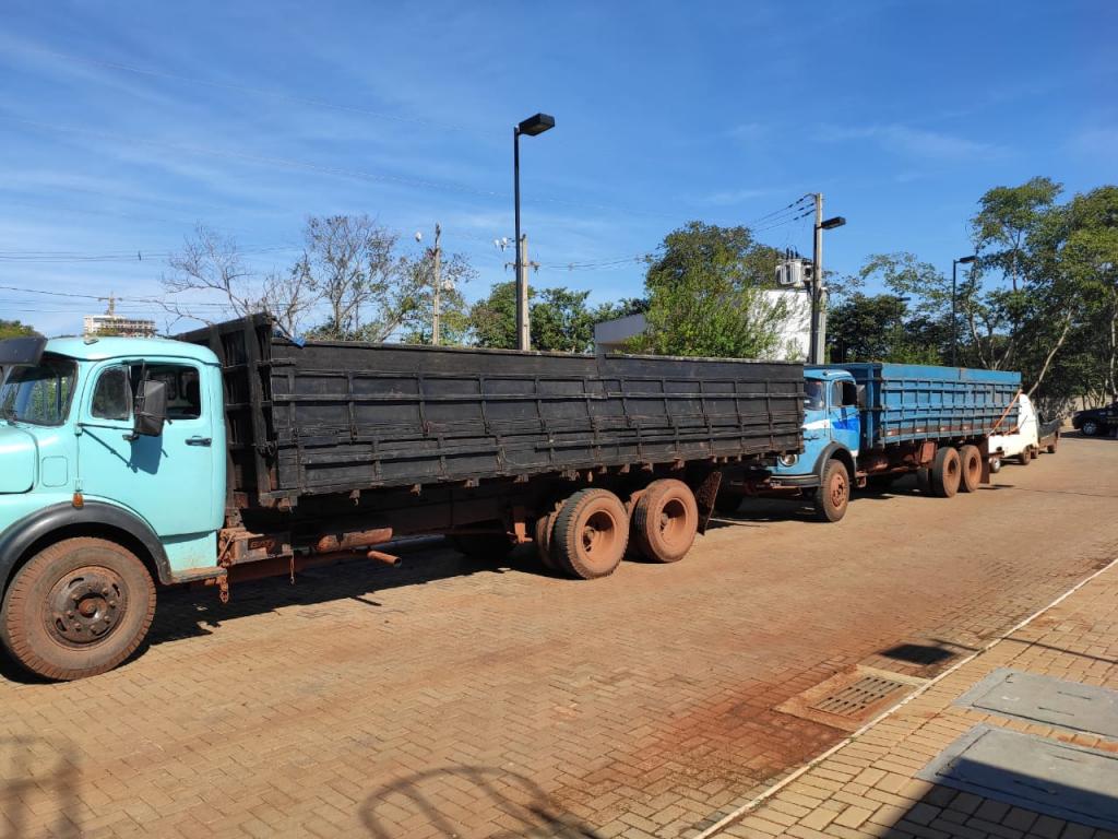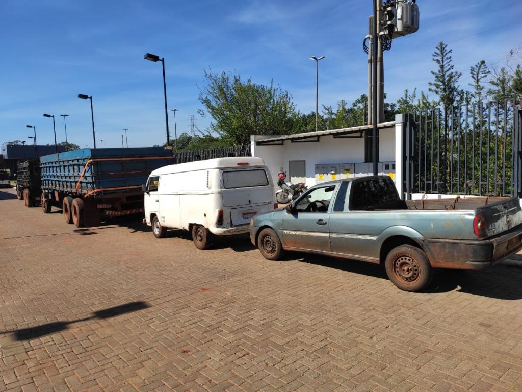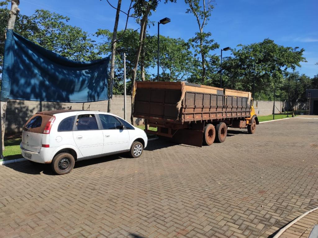 Após acompanhamento tático, equipe policial identificou um esconderijo onde foram localizados outros dois veículos automotores, quatro caminhões e mais caixas de cigarro paraguaios.