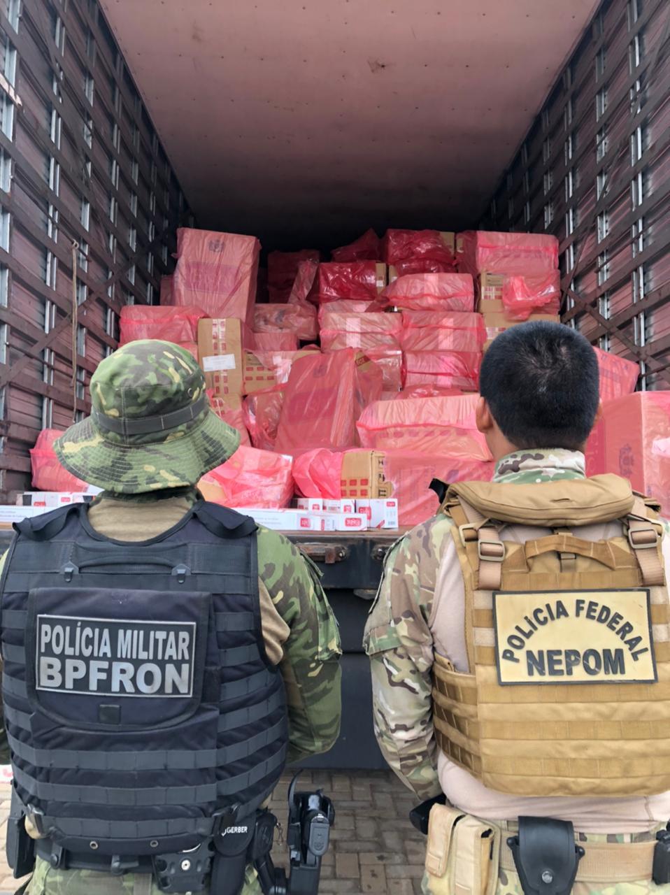 A ação integrada entre Polícia Federal e BPFRON/PMPR, apreendeu um caminhão baú com cerca de 200 (duzentas) caixas de cigarro paraguaio.