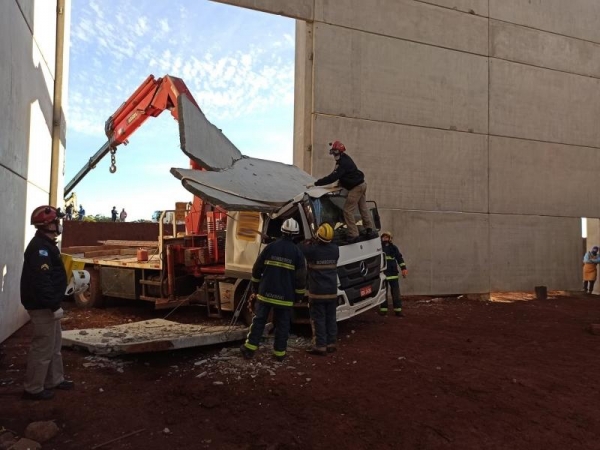 Segundo informações coletadas, uma placa de concreto caiu em cima da cabine do caminhão deixando o motorista preso em meio as ferragens do veículo.