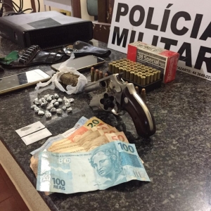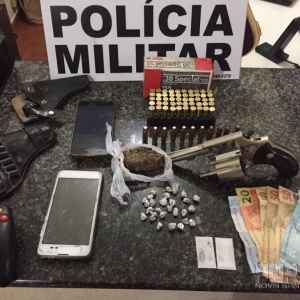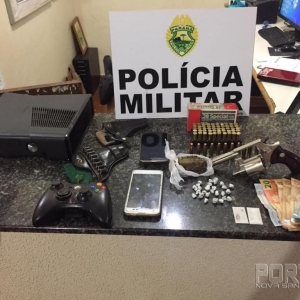 Foram apreendidos também duas giletes usadas para processar entorpecente, um celular branco de marca Multilaser, um celular preto sem marca, um videogame X Box preto com controle e fonte de energia, dois coldres velados para acomodar arma e munições.