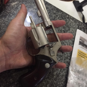 Perguntado sobre a possível arma, indicou que havia deixado ela dentro da casa para a qual correu, sendo esta apreendida em cima de uma estante na sala de estar, foi apreendido um revólver calibre 38 de marca Taurus (nº série CJ 61742).
