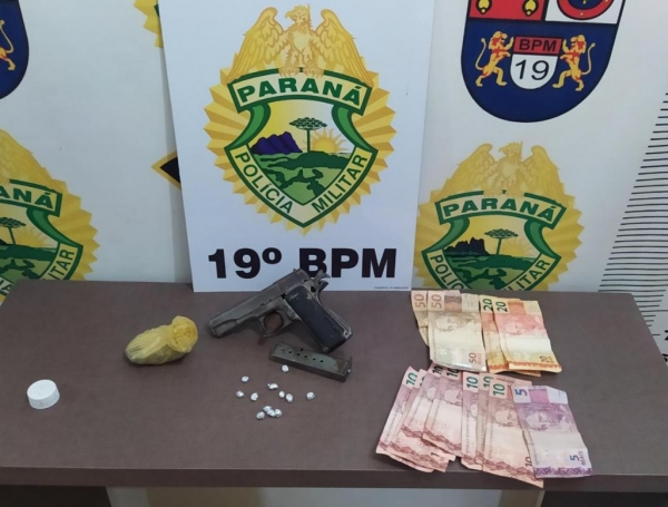 Em revista na casa foram localizados em dos quartos 30 gramas de maconha e uma arma de fogo 7.65mm/32 com duas munições intactas.