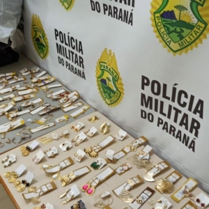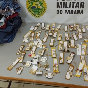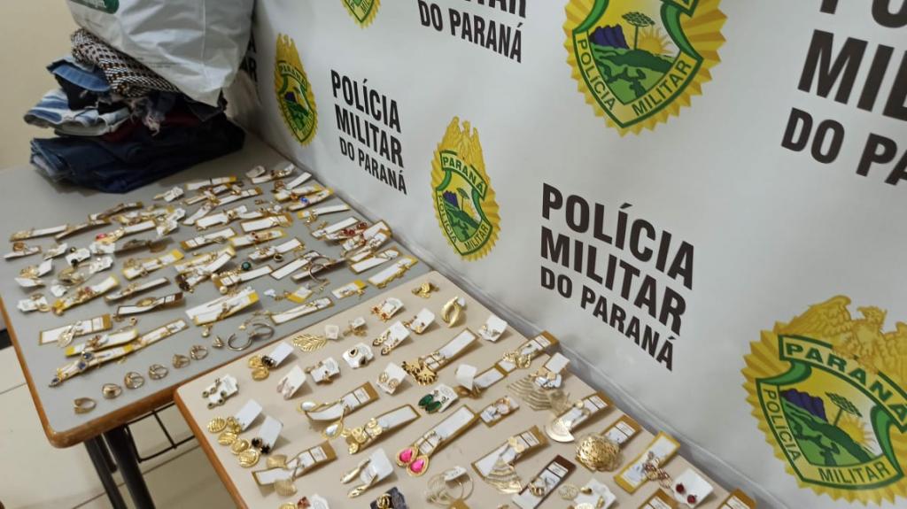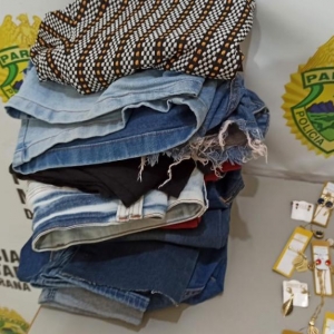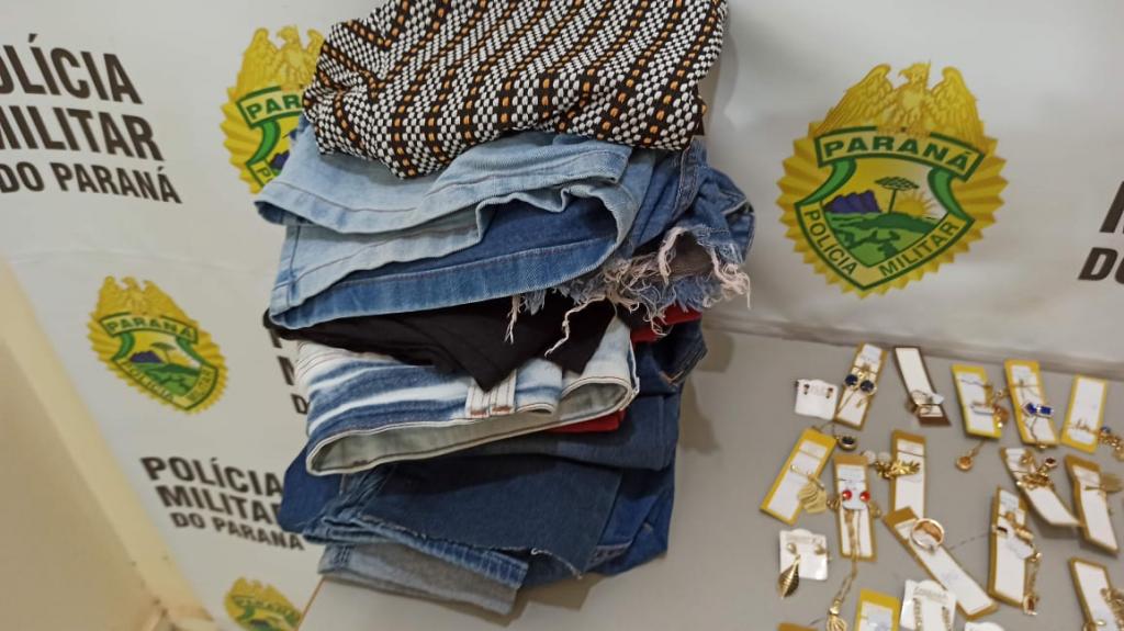 Os policiais se deslocaram até o local e encontraram uma bolsa contendo 17 peças de roupas femininas e em outra sacola encontraram 122 semi jóias até o momento não existe queixa de furto mas provavelmente tenha sido furtado de alguma loja.