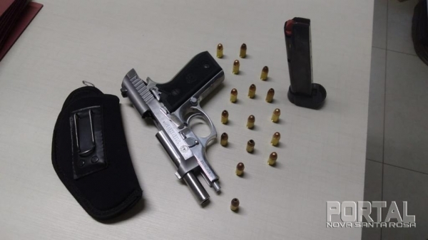 Tal atitude levantou a suspeita, e a equipe policial realizou abordagem do veículo, que em busca pessoal nos dois ocupantes nenhum ilícito foi encontrado, mas em busca veicular foi localizado embaixo do banco do carona uma arma de fogo do tipo pistola cal. 380, municiada e carregada, contendo 16 munições intactas e um coldre, que indagado a ambos sobre a arma de fogo, os dois não se manifestaram.