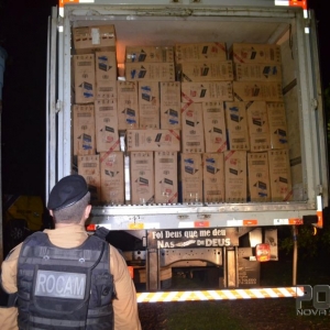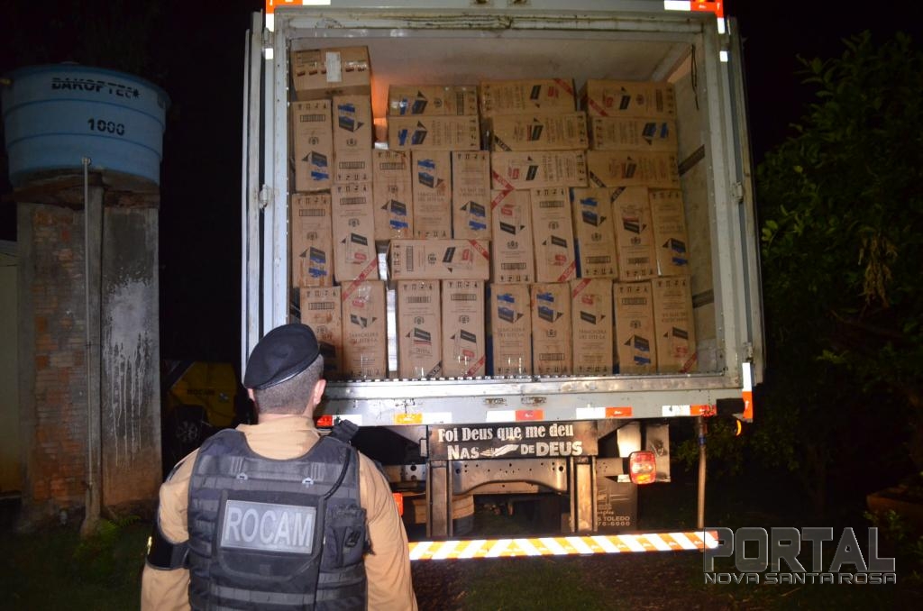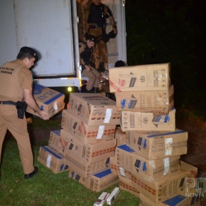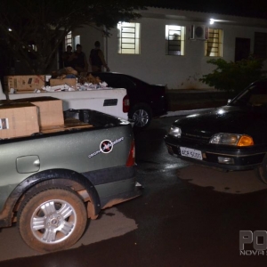 Por volta das 21h30 de ontem (10), na rua Guarani, Vila Becker, em rápida ação de inteligência, policiais chegaram no endereço onde estaria sendo armazenado produto de contrabando. No local, foi constatado 03 veículos, GM Monza, placas ACR-5005, um FIAT Strada, placas AFZ-3838, uma camioneta GM S10, placas ATE-1894 e 03 caminhões, totalizando 313 caixas de cigarros oriundos do Paraguai.
