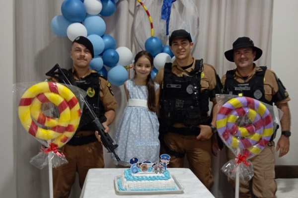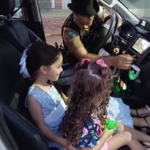 Tendo concluído com sucesso a missão de cantar os parabéns, na sequência tiraram fotos e apresentaram a viatura para a pequena, que é uma super admiradora da Polícia Militar.