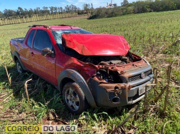 O condutor da Fiat Strada, com placas de Cascavel, perdeu o controle do veículo após um pneu traseiro estourar.