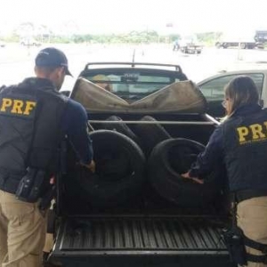 No compartimento de carga e no banco do passageiro da Volkswagen Saveiro os policiais encontraram 35 pneus trazidos do Paraguai. O condutor, um rapaz de 29 anos, afirmou que revenderia os produtos em Tamboara, no Noroeste do estado.