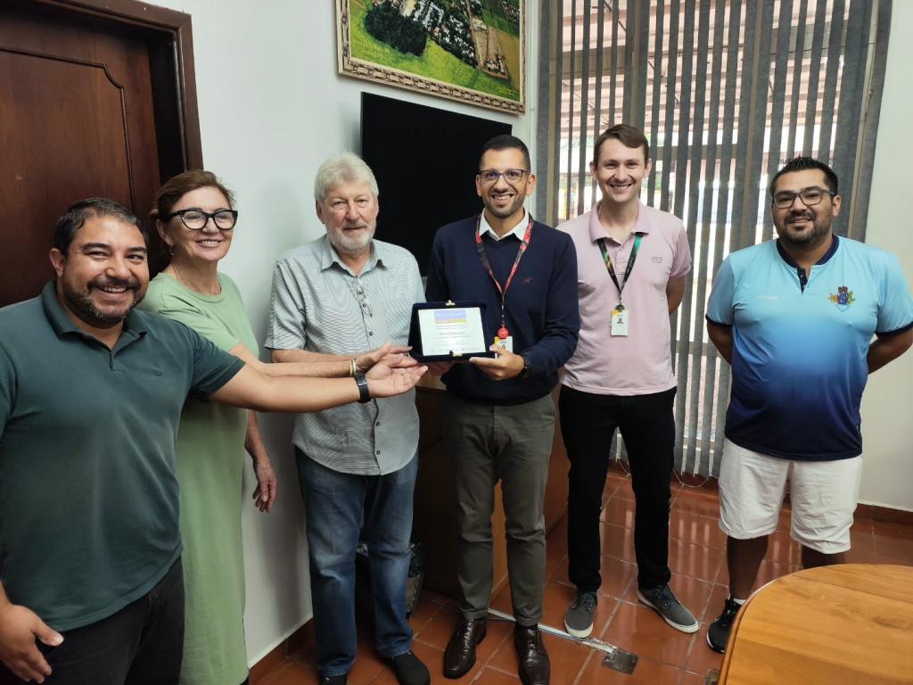 Nesta terça-feira (08), o prefeito de Nova Santa Rosa, Lari Hitz, recebeu a visita de representantes do SESC (Serviço Social do Comércio), que vieram prestigiar o município pela participação ativa no Dia do Desafio, evento promovido anualmente para incentivar a prática de atividades físicas em toda a população. Durante o encontro, o município foi homenageado com uma placa simbólica, reconhecendo seu empenho e envolvimento no incentivo à saúde e bem-estar da comunidade.
