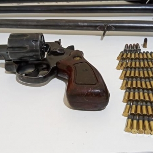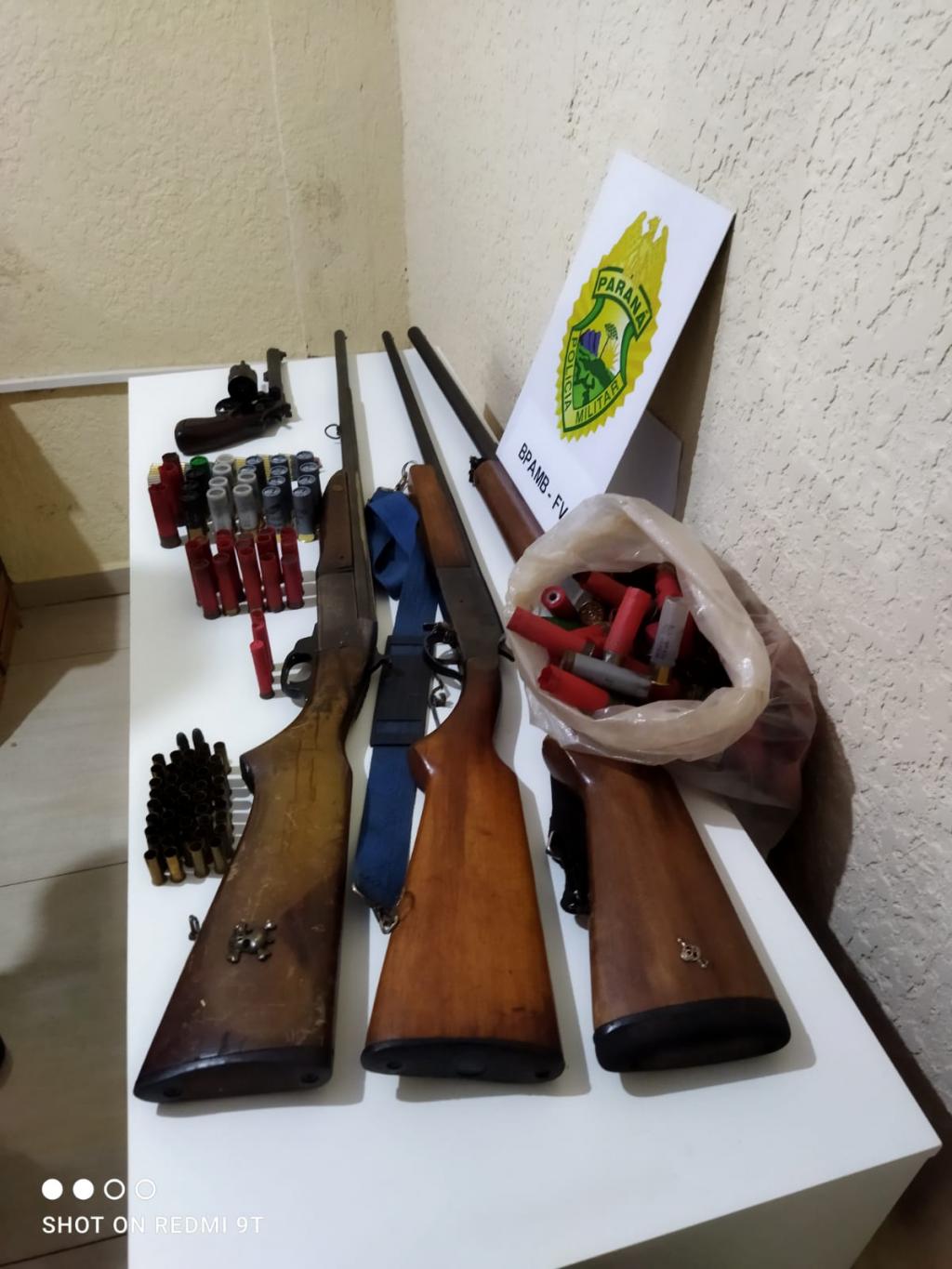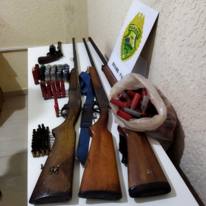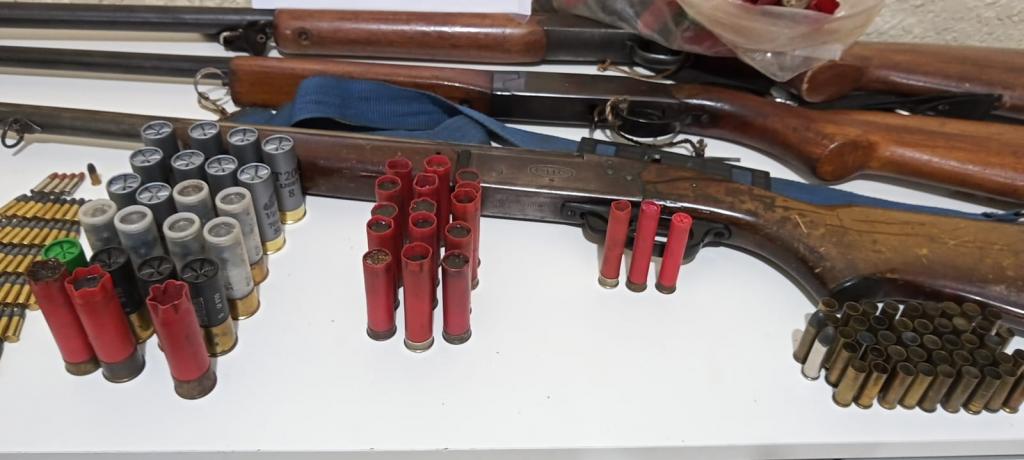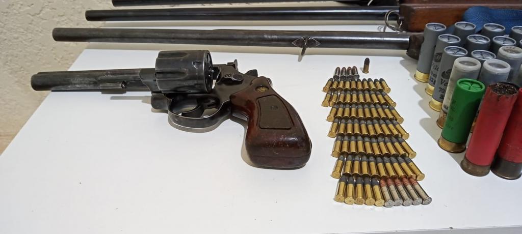 No local, a equipe policial apreendeu 04 armas de fogo de calibre permitido, 116 munições intactas e 182 munições deflagradas, as quais eram mantidas em posse/porte sem a devida autorização.