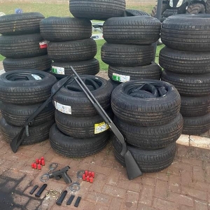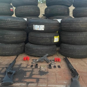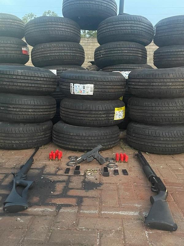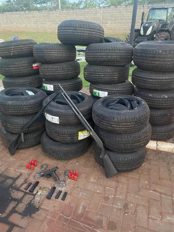 Os pneus, contados, totalizaram 210 (duzentas e dez) unidades. Ato contínuo, houve deslocamento até a residência da propriedade, na qual a moradora, de 19 anos, indicou a titularidade do marido, de 33 anos, em relação aos pneus. Indagada se haveria mais ilícitos no imóvel, foi informado que havia armas de fogo e, tendo franqueada a entrada, os policias localizaram três armas de fogo, sendo uma espingarda calibre .12, com treze munições intactas; uma espingarda tipo rifle, calibre .22; e uma pistola Taurus TH 380, com um carregador e treze munições.
