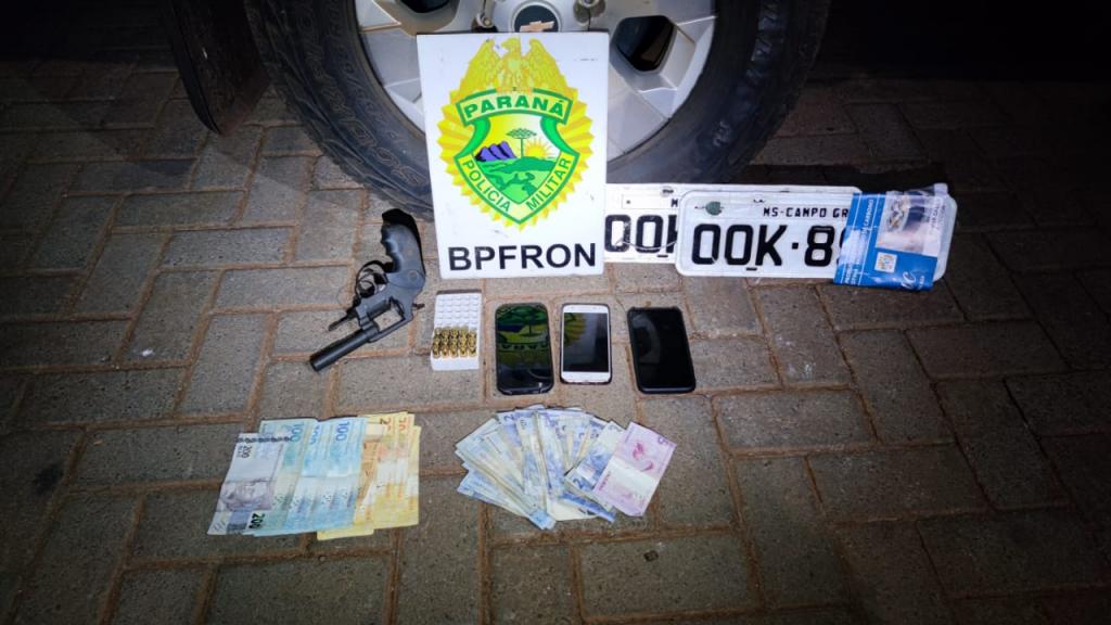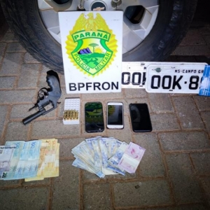 Nela foram encontradas três motocicletas, cinco carros carregados com cigarros contrabandeados, um depósito com mais pacotes de cigarros contrabandeados, um revólver calibre 38, 14 munições do mesmo calibre, três aparelhos celulares, cadernos com anotações de atividades criminosas e R$1.327,00 em espécie.