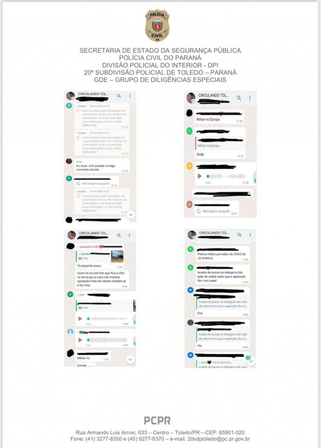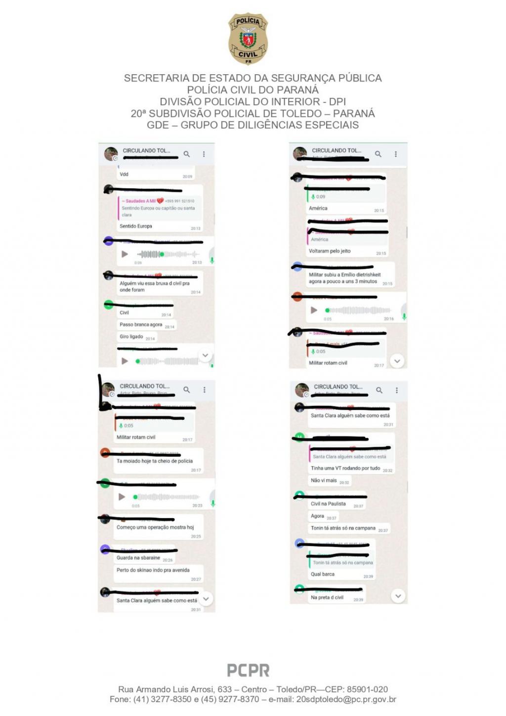 Os alvos são apontados como administradores de grupos em aplicativo de mensagens que tinham como finalidade o monitoramento da rotina das forças de segurança pública, em especial da Polícia Civil e da Polícia Militar, no município de Toledo. O grupo, com mais de 600 integrantes, era utilizado para compartilhar em tempo real informações sobre ações policiais, muitas vezes frustrando diligências, operações e prejudicando serviços de interesse público.