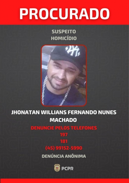 A Polícia Civil do Paraná (PCPR) está em busca de Jhonatan Willians Fernando Nunes Machado, suspeito do homicídio de Fernando Augusto Coitinho Ferandin, ocorrido em 14 de outubro deste ano, no bairro Jardim Coopagro, em Toledo. Segundo o delegado Leandro Stabile, o crime teria sido motivado por um desentendimento negocial entre o suspeito e a vítima.