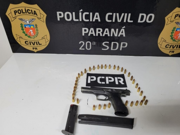 Na tarde de hoje (17), equipes de investigação da 20ª Subdivisão Policial de Toledo durante diligências pelo Bairro Jardim Gisela, na altura da Rua Barão do Rio Branco, realizaram a abordagem de um rapaz de 20 anos de idade, já conhecido do meio policial pela prática de crimes de homicídio tentado e consumado, localizaram em posse do elemento uma arma de fogo do tipo pistola, calibre 9mm, juntamente com dois carregadores e 37 munições intactas de mesmo calibre.