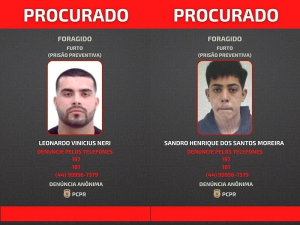 A Polícia Civil do Paraná (PCPR) divulgou as fotos de dois homens, de 18 e 24 anos, foragidos pela prática de um furto ocorrido em uma Universidade de Guaíra. O ato foi flagrado por câmeras de segurança.