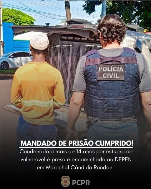 A Polícia Civil do Paraná (PCPR), por meio da 47ª Delegacia Regional de Polícia (DRP) de Marechal Cândido Rondon, realizou a prisão de um homem de 38 anos nesta sexta-feira (06). Contra ele, pesava um mandado de prisão definitiva pelo crime de estupro de vulnerável.