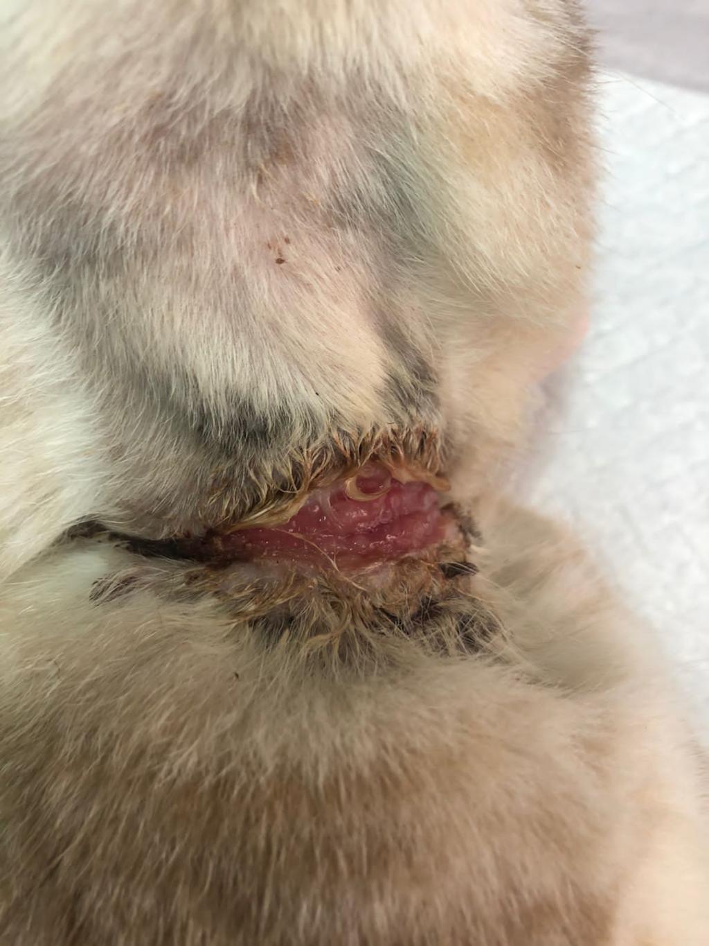 Os policiais ao chegarem na residência localizada no Jardim Bressam, encontraram um gato apresentando cortes graves em seu pescoço e um cachorro também vítima de maus tratos.