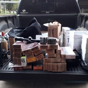 Na ação policial, duas pessoas foram presas em flagrante, sendo apreendidos cigarros contrabandeados, miras telescópicas, armas a gás, anabolizantes, pneus, celulares, um veículo e uma embarcação, além de 01 espingarda calibre 12, municiada com 06 cartuchos intactos.