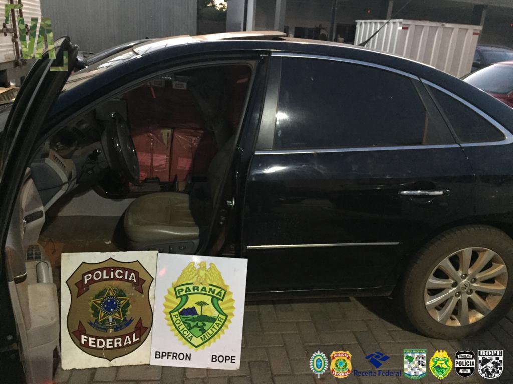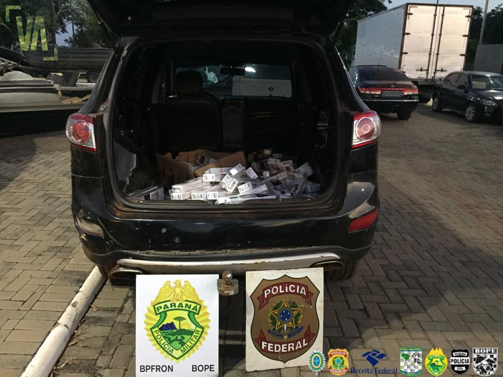 As equipes notaram a presença de dois veículos Hyundai Santa Fé no local informado, sendo que, na tentativa de abordagem, um veículo foi abandonando no local e o outro iniciou fuga em direção à cidade e durante o acompanhamento os policiais chegaram a um ponto conhecido como “mocó” (esconderijo em meio à mata) onde estavam mais sete veículos carregados com cigarros contrabandeados.