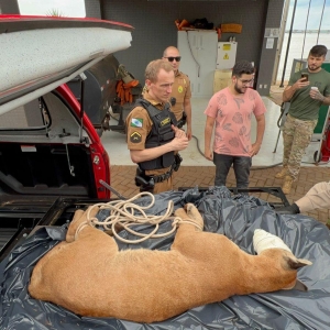 Ao longo desta terça-feira (22), Força Tarefa composta por PF, BPFRON, PMPR, BOMBEIROS e Prefeitura Municipal foi acionada por moradores para resgate de uma onça parda que se encontrava acuada em cima de uma árvore dentro do município.