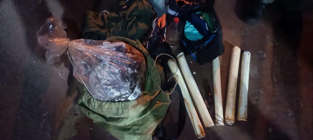 Os criminosos estavam com dois animais abatidos (veado mateiro), 10 unidades de palmitos jussara in natura (espécie ameaçada de extinção) extraídos ilegalmente, 01 (um) rifle cal. 22, facas, lanternas e roupas sujas com odor de fumaça (típicos de acampamento).