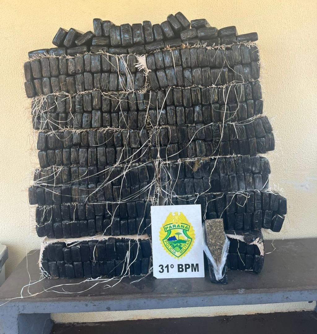 No porta-malas, foram localizados cerca de oito sacos contendo a mesma substância. O indivíduo, cuja identidade não foi divulgada, foi preso em flagrante e conduzido junto com o veículo até o 31º BPM (Batalhão de Polícia Militar) para a pesagem da droga e demais procedimentos legais. A pesagem totalizou 250 kg de maconha.