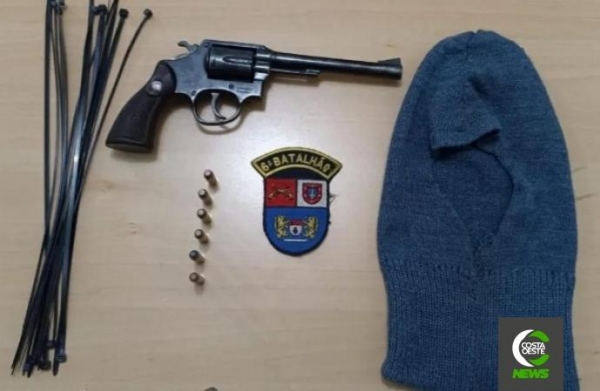 Em abordagem foi encontrado um revólver calíbre 38 special com seis munições, uma balaclava, uma bolsa com vários “enforca-gato”.