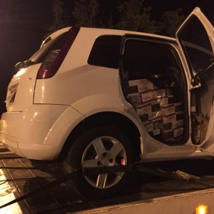 Após vistoriar o veículo, foram localizados, em seu interior e porta malas, aproximadamente seis mil maços de cigarros das marcas Eight e Palermo, oriundos do Paraguai.