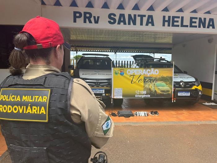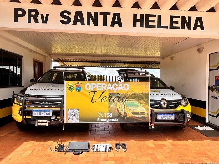 Nas proximidades do km 74, na zona rural de Santa Helena, os policiais localizaram um casal em atitude suspeita no pátio de uma igreja. Durante a abordagem, foram encontrados dois notebooks (um já danificado), um par de tênis e uma bolsa com os suspeitos, ambos de 35 e 41 anos.