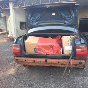 Durante a abordagem, foi perguntado a passageira do veículo qual material estaria no veículo e a mesma afirmou que teriam oito caixas de cigarro, de variadas marcas, todas oriundas do Paraguai.