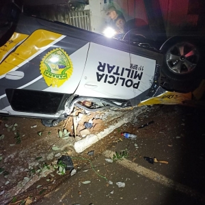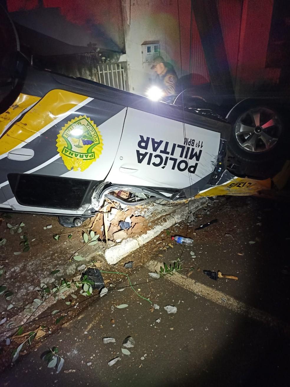 Dois policiais militares ficaram feridos após a viatura em que eles estavam bater contra um poste e capotar durante uma tentativa de abordagem a um veículo suspeito, em Corumbataí do Sul, no centro-oeste do Paraná, segundo a Polícia Militar (PM).