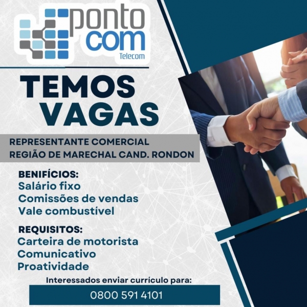 A Ponto Com Telecom está com processo seletivo aberto para o cargo de Representante Comercial. A empresa busca profissionais com perfil comunicativo, proativo e que possuam carteira de motorista.