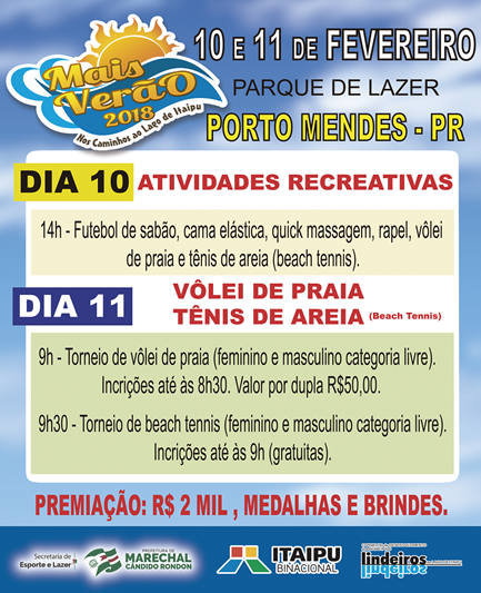 Após o projeto Mais Verão 2018 passar por Mercedes, Itaipulândia e Entre Rios do Oeste, chegou a vez de Marechal Rondon, São José das Palmeiras e Mundo Novo (MS) sediarem o evento. No município rondonense, a segunda etapa do projeto será realizada no distrito turístico de Porto Mendes, no sábado (10) e domingo (11). Estarão em disputa as modalidades de vôlei de praia e tênis de areia (Beach Tennis). O projeto faz parte da programação do 5° Festival de Ecoturismo Verão de Marechal Rondon.