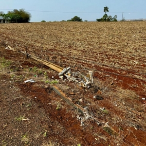 Contudo, não é descartada a possibilidade de algum veículo ter colidido contra o referido poste, dadas as circunstâncias nas quais o poste se encontra, todo destruído. Também é possível observar no local alguns rastros, bem como peças quebradas de algum veículo.