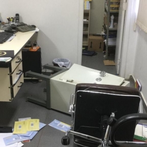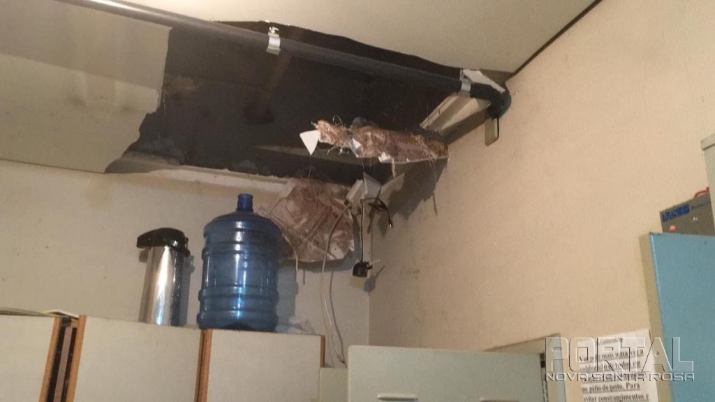 Quando a equipe chegou no local o proprietário do posto, já estava no local, o mesmo informou a equipe que por volta das 06h00 de ontem (23), chegou para trabalhar e percebeu que seu posto havia sido furtado, mostrou a cozinha onde havia um buraco no gesso do teto, sendo que foi possivelmente por onde os indivíduos entraram, da cozinha lavaram um malote de aproximadamente quatro mil reais, posteriormente foram até o cofre da empresa e o arrombaram levando a quantia de dezessete mil reais, e o troco de uma de suas gavetas do escritório onde tinha também aproximadamente três mil reais.