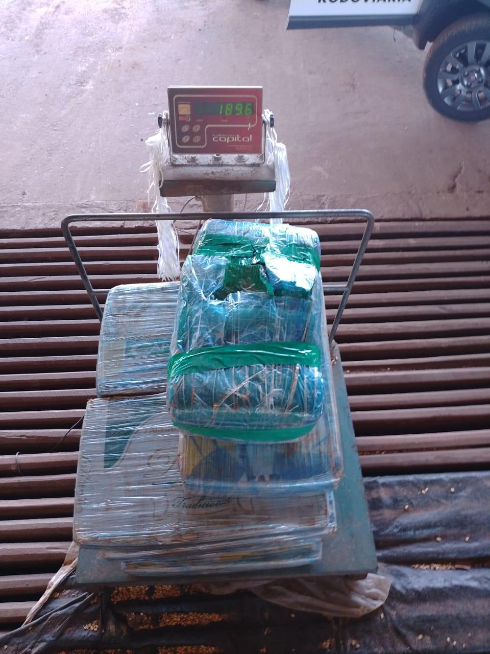 O veículo foi encaminhado a uma cooperativa existente próxima e realizado a pesagem, no qual totalizou 189,6 kg da substância.