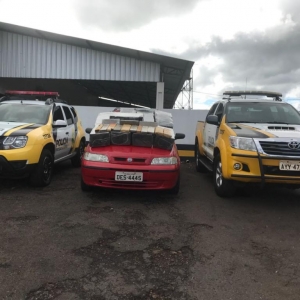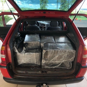 Na abordagem ao Palio Weekend, foi localizado no bagageiro, nove fardos com 298 tabletes de maconha, que pesou 230,400 Kg.