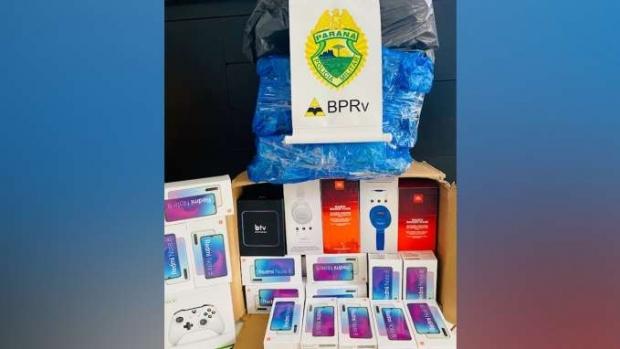 Ao realizar vistoria do veículo, foi encontrado três volumes no bagageiro, contendo produtos contrabandeados do Paraguai, como celulares, vídeo games, relógios, minoxidil, cartão de memória, controle de vídeo game, perfumes de diversas marcas e modelos, fone de ouvido, modem de internet wi-fi.