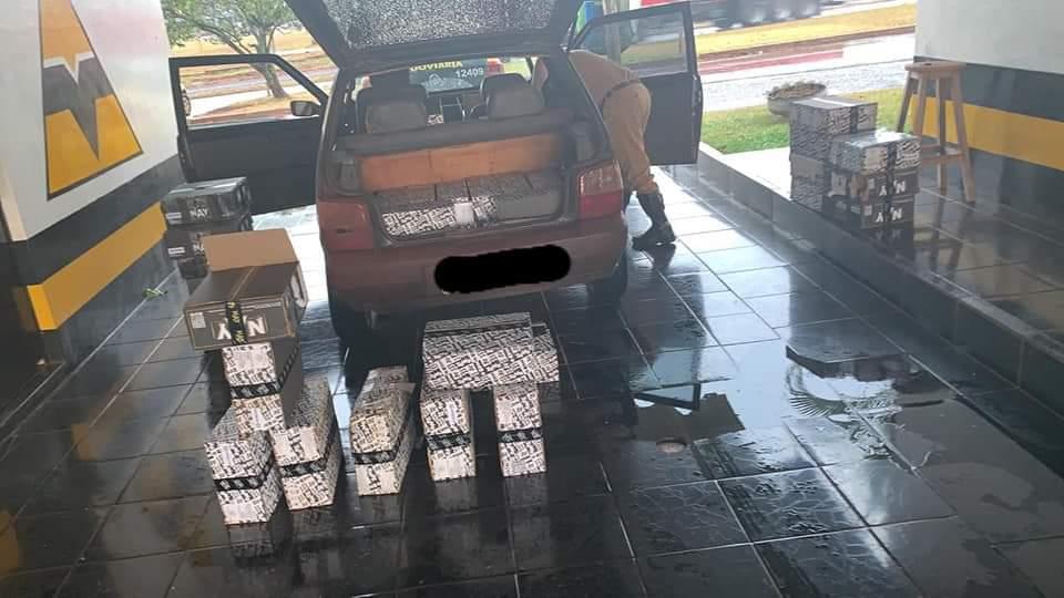 O veículo, um Fiat Uno azul ano 2004 com placas de Palotina, que ao ser vistoriado seu interior constatou que estava carregado de essência de Narguilé proveniente do Paraguai.